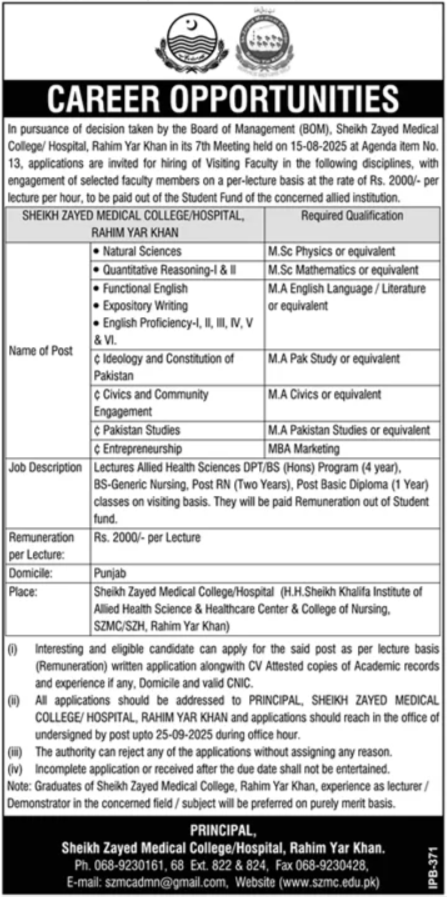 Sheikh Zayed Medical College announced new jobs for the position of Visiting Faculty, Professor, Lecturer. These jobs are related to Management category and Government jobs. The minimum qualification required for this job is Bachelor, Master, Mphil, Phd.