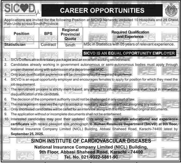 Sindh Institute of Cardiovascular Diseases announced new jobs for the position of Statistician. These jobs are related to Management category and Government jobs. The minimum qualification required for this job is Bachelor, Master, MS, BS.