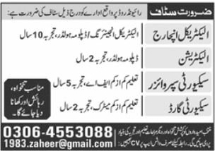 Private Company announced new jobs for the position of Electrical Incharge, Electrician, Security Supervisor, Security Guard. These jobs are related to Management category and Government jobs. The minimum qualification required for this job is Matric, Intermediate, DAE.
