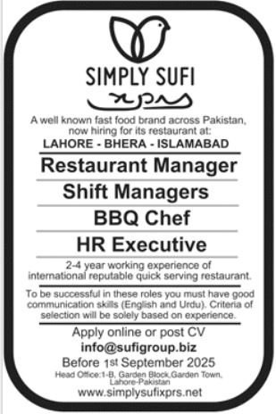 Simply Sufi announced new jobs for the position of Restaurant Manager, Shift Managers, Bbq Chef, Hr Executive. These jobs are related to Management category and Government jobs. The minimum qualification required for this job is Matric, Intermediate, Bachelor, Master.