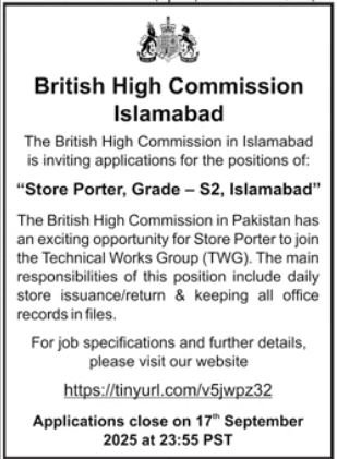 British High Commission Islamabad announced new jobs for the position of Store Porter. These jobs are related to Embassy category and Government jobs. The minimum qualification required for this job is Intermediate, Bachelor.