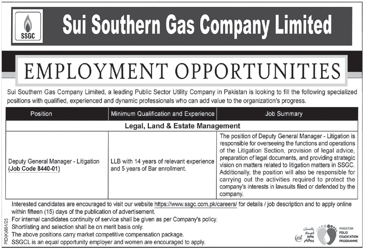 Sui Southern Gas Company Limited SSGC announced new jobs for the position of Deputy General Manager, Deputy General Manager Litigation. These jobs are related to Management category and Government jobs. The minimum qualification required for this job is Bachelor, LLb, Others.