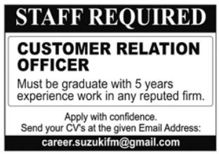 Suzuki Federal Motors announced new jobs for the position of Customer Relation Officer Cro. These jobs are related to Management category and Government jobs. The minimum qualification required for this job is Bachelor, BS.