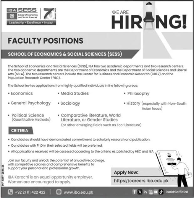 Institute of Business Administration IBA announced new jobs for the position of Faculty Positions, School Of Economics Social Sciences, Lecturer, Professor, Associate Professor, Assistant Professor. These jobs are related to Management category and Government jobs. The minimum qualification required for this job is Bachelor, Master, Mphil, Phd, MS, BS.