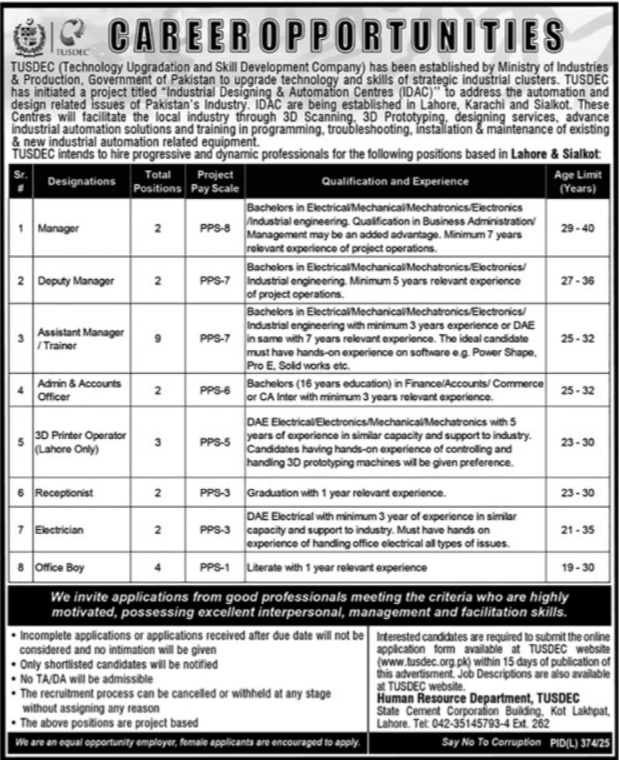 Technology Upgradation and Skill Development Company TUSDEC announced new jobs for the position of Manager, Deputy Manager, Assistant Manager, Trainer, Admin Officer, Account Officer, Three D Printer Operator, Receptionist, Electrician, Office Boy. These jobs are related to Management category and Government jobs. The minimum qualification required for this job is Middle, Matric, Bachelor, Master.