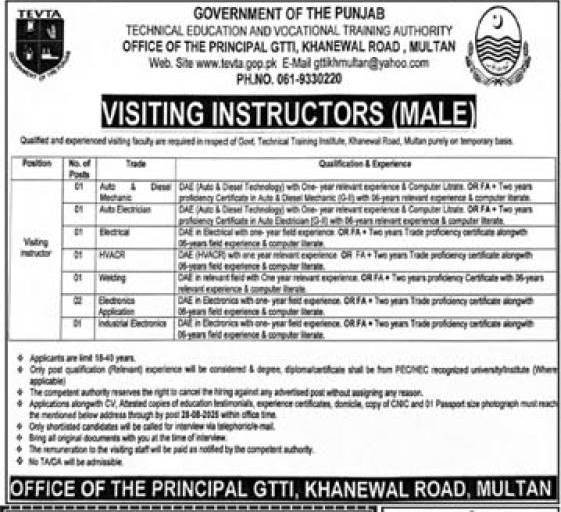 Technical Education & Vocational Training Authority TEVTA announced new jobs for the position of Visiting Faculty, Lecturer, Professor. These jobs are related to Education category and Government jobs. The minimum qualification required for this job is Bachelor, Master, Mphil, Phd.