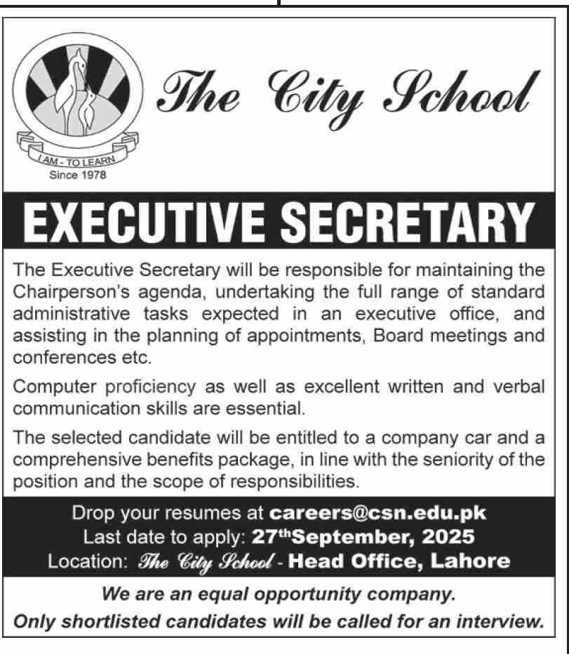 The City School announced new jobs for the position of Executive Secretary. These jobs are related to Secretarial category and Government jobs. The minimum qualification required for this job is Bachelor, Master, MS, BS.
