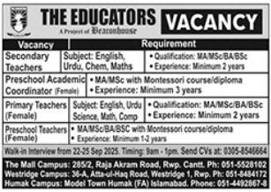 The Educators announced new jobs for the position of Secondary Teacher, English Teacher, Urdu Teacher, Chemistry Teacher, Maths Teacher, Academic Coordinator, Computer Science Teacher, Preschool Teacher. These jobs are related to Education category and Government jobs. The minimum qualification required for this job is Bachelor, Master, MS, BS.