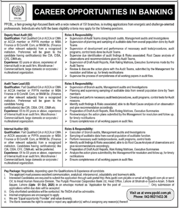 The Punjab Provincial Cooperative Bank Ltd PPCBL announced new jobs for the position of Deputy Head Audit (G2), Audit Team Lead (G2), Internal Auditor (G2). These jobs are related to Management category and Government jobs. The minimum qualification required for this job is Bachelor, Master, MS, BS.