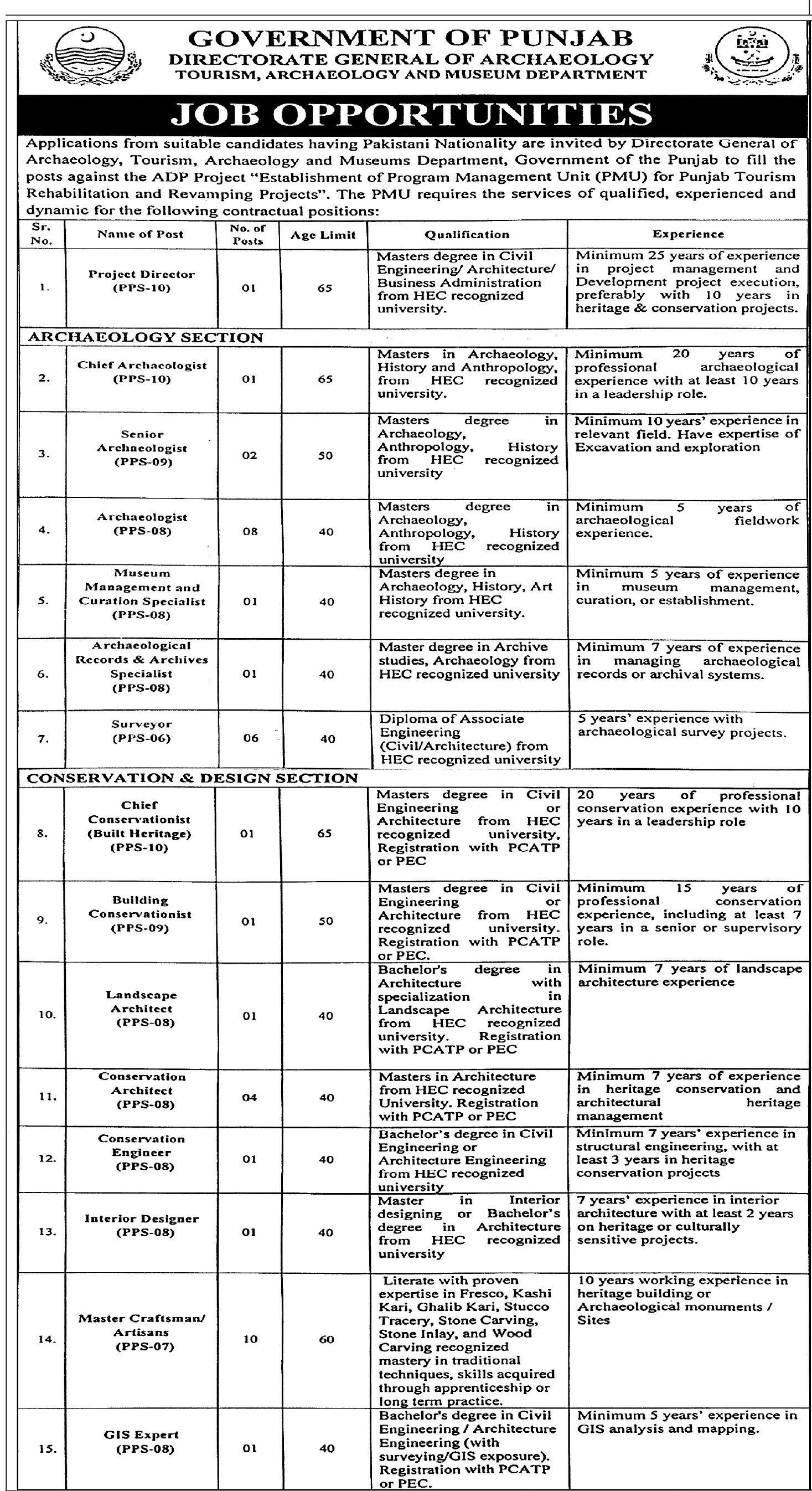 Tourism Archaeology & Museum Department announced new jobs for the position of Project Director, Chief Archaeologist, Archaeologist, Museum Management Curation Specialist, Archaeological Records Specialist, Archives Specialist, Surveyor, Chief Conservationist, Building Conservationist, Landscape Architect, Conservation Architect, Conservation Engineer, Interior Designer, Master Craftsman, Artisan, Gis Expert, Photogrammetry Expert, 3d Documentation Expert, Cad Operator, Chief Development Officer, Structural Engineer, Electrical Engineer, Public Health Engineer, Civil Engineer, Monitoring Expert, Evaluation Expert, Monitoring Officer, Evaluation Officer, Supervisor, Procurement Specialist, Procurement Officer, Contract Management Specialist, Legal Expert, Tourism Development Specialist. These jobs are related to Management category and Government jobs. The minimum qualification required for this job is Intermediate, Bachelor, Master, DAE, LLb, LLM, B.E, Others, BS.