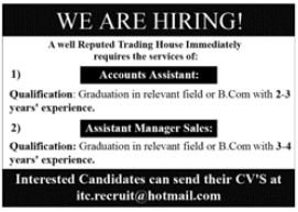 Trading House announced new jobs for the position of Account Assistant, Assistant Manager Sales. These jobs are related to Management category and Government jobs. The minimum qualification required for this job is Bachelor, BS.