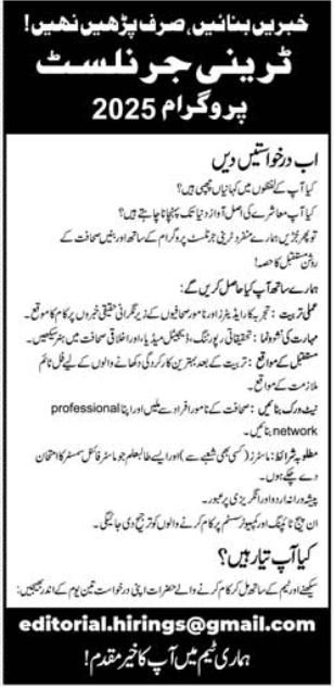 The job is located in Karachi and it is necessary for candidate to read mentioned requirements for available vacancies. Jang newspaper published this job ad on 21 September, 2025. Last date to apply this job is 24 September, 2025