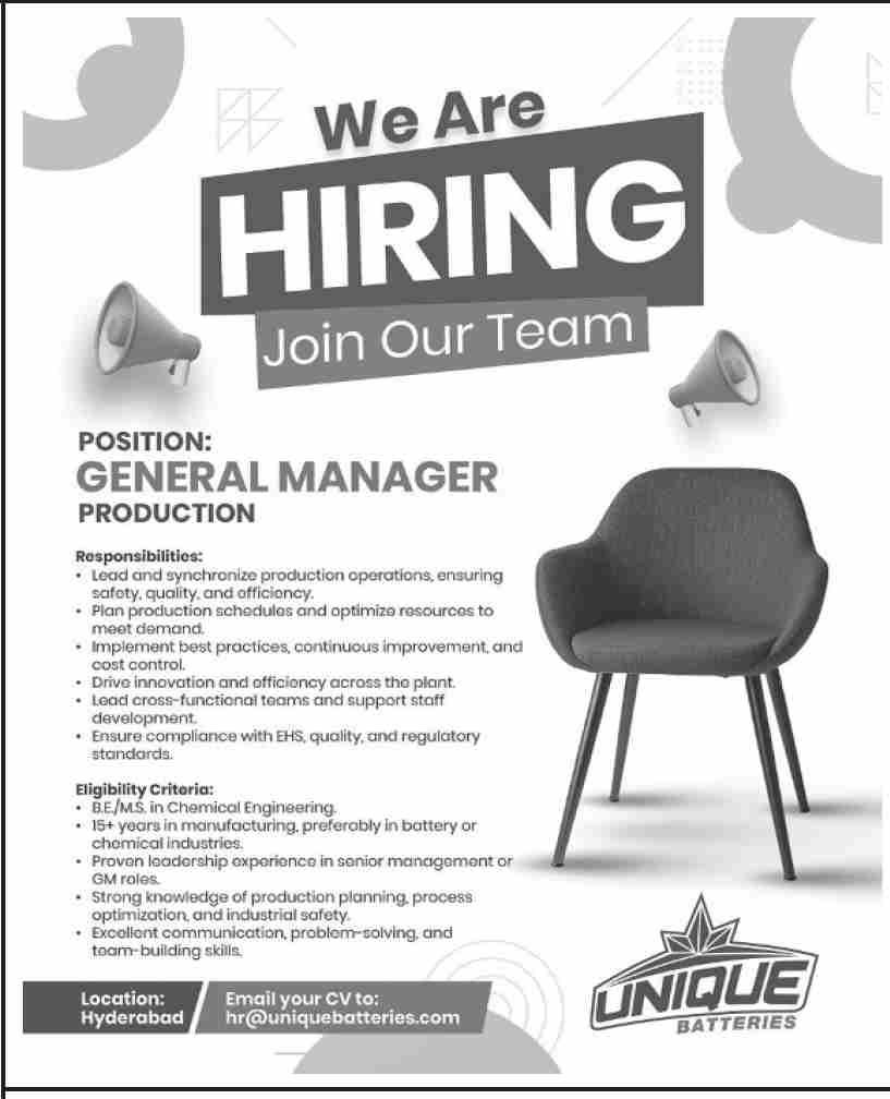 Unique Batteries Pvt Ltd announced new jobs for the position of General Manager. These jobs are related to Management category and Government jobs. The minimum qualification required for this job is Bachelor, Master, MS, BS.