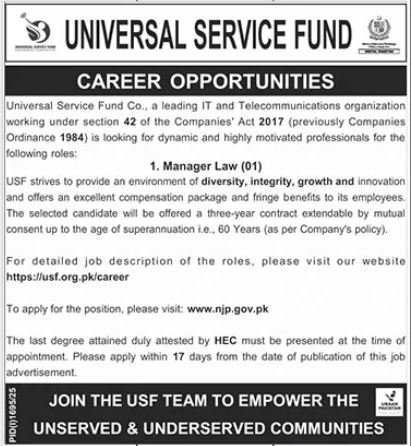 Universal Service Fund announced new jobs for the position of Manager Law. These jobs are related to Management category and Government jobs. The minimum qualification required for this job is Bachelor, Master, MS, BS.