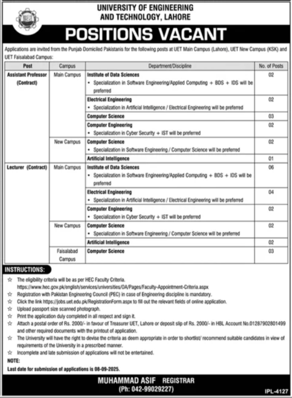 University of Engineering and Technology UET announced new jobs for the position of Assistant Professor, Lectuer. These jobs are related to Management category and Government jobs. The minimum qualification required for this job is Master, Mphil, Phd, MS.