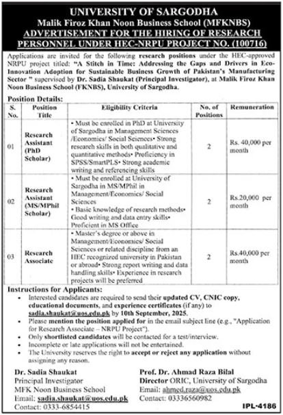 University of Sargodha UOS announced new jobs for the position of Research Assistant, Research Associate. These jobs are related to Education category and Government jobs. The minimum qualification required for this job is Bachelor, Master, Mphil, Phd.