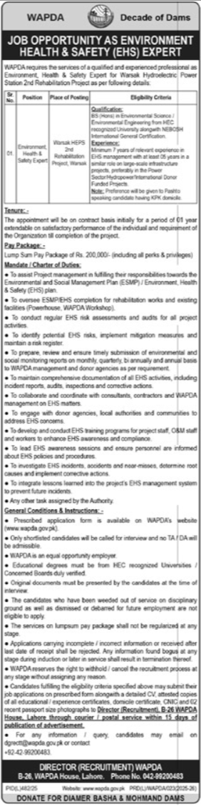 Water and Power Development Authority WAPDA announced new jobs for the position of Environment Health Safety Expert. These jobs are related to Management category and Government jobs. The minimum qualification required for this job is Bachelor, Master.