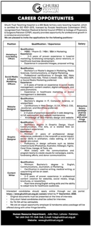 Ghurki Trust Teaching Hospital announced new jobs for the position of Marketing Fund Raising Officer, Social Media Digital Marketing Officer, Website Designer, Graphic Designer, Content Writer. These jobs are related to Management category and Government jobs. The minimum qualification required for this job is Bachelor, Master, BBA, MBA, MBBS, Pharma D.