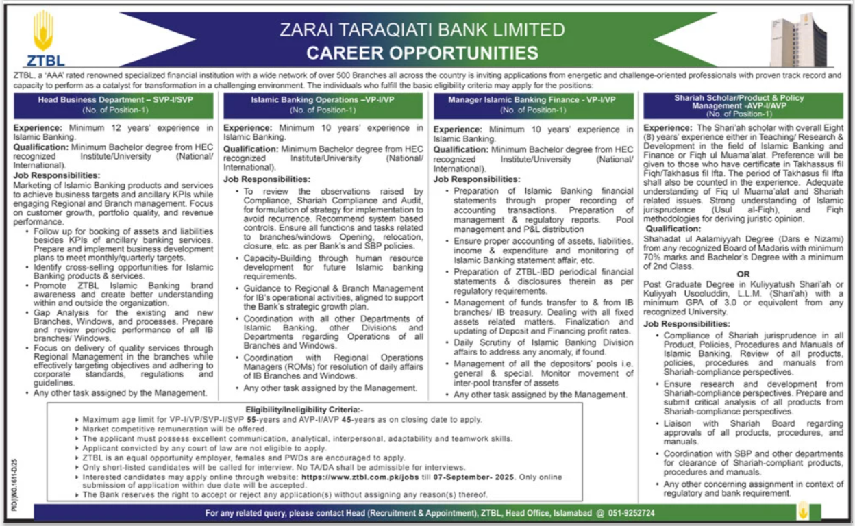 Zarai Taraqiati Bank Limited ZTBL announced new jobs for the position of Head Business Department, Islamic Banking Operations, Manager Islamic Banking Finance, Shariah Scholar/Product & Policy Management. These jobs are related to Management category and Government jobs. The minimum qualification required for this job is Bachelor, Master.