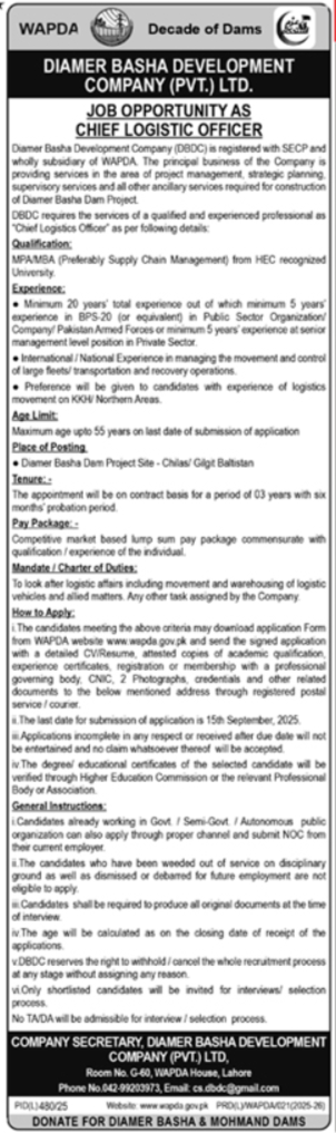 Diamer Basha Development Company announced new jobs for the position of Chief Logistics Officer. These jobs are related to Management category and Government jobs. The minimum qualification required for this job is Bachelor, Master.