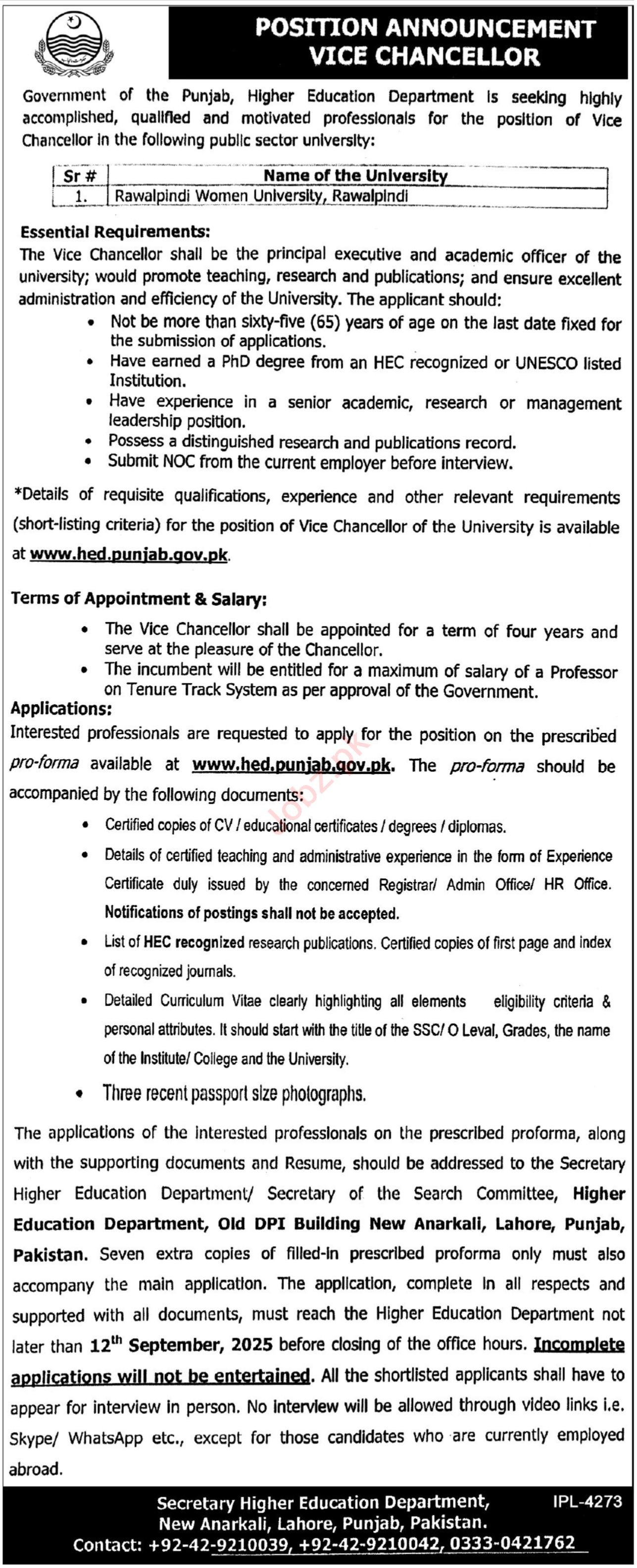 Higher Education Department announced new jobs for the position of Vice Chancellor. These jobs are related to Management category and Government jobs. The minimum qualification required for this job is Phd.