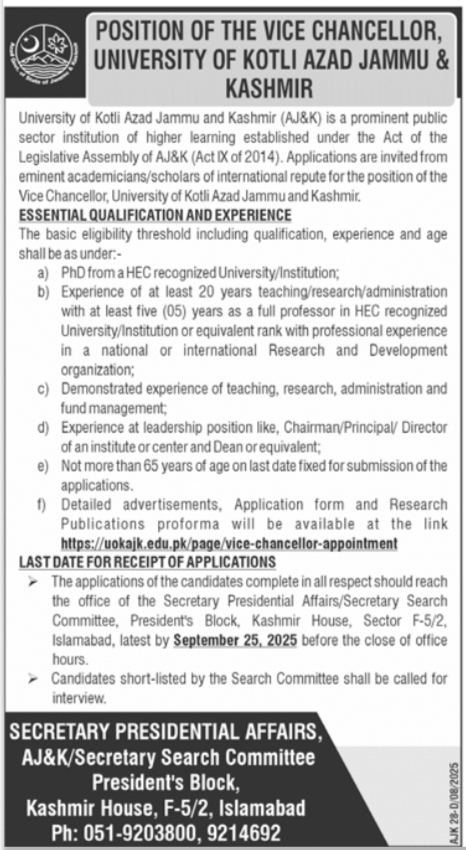 University of Kotli announced new jobs for the position of Vice Chancellor. These jobs are related to Education category and Government jobs. The minimum qualification required for this job is Mphil, Phd, MS.