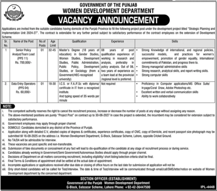 Women Development Department announced new jobs for the position of Policy Analyst, Team Lead, Data Entry Operator. These jobs are related to Management category and Government jobs. The minimum qualification required for this job is Intermediate, Master, Others, ICS.