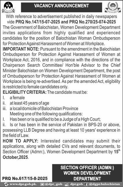 Women Development Department announced new jobs for the position of Ombudsperson. These jobs are related to Human Resource category and Government jobs. The minimum qualification required for this job is Bachelor, LLb, Others.